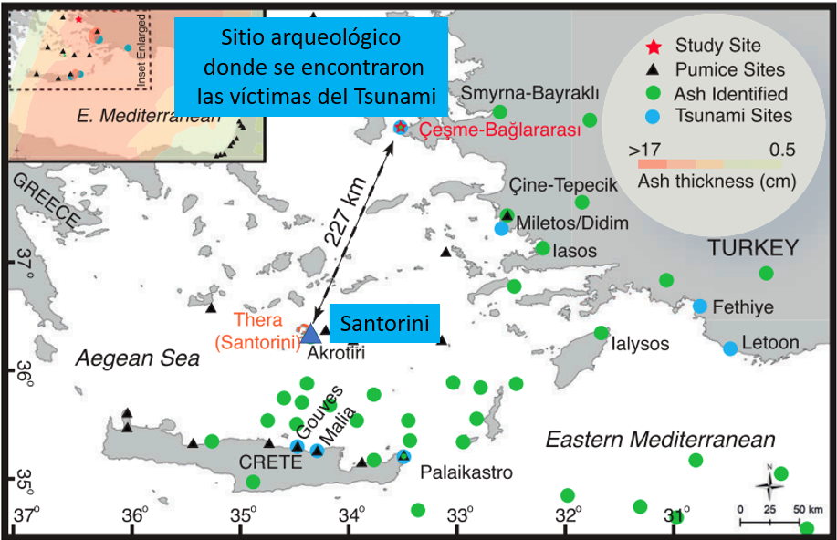 En una reciente publicación científica, arqueólogos de la Universidad de Ankara describen los restos de un hombre y un perro, donde toda la evidencia apunta a que fueron sepultados por los escombros de los tsunamis que en esa época azotaron la costa occidental de lo que hoy es Turquía. Se trata del sitio arqueológico de Çeşme-Bağlararası, ubicado unos 220 kilómetros al norte de Santorini, el cual aloja importantes restos de la edad de Bronce, que es justamente el período de las civilizaciones humanas que se vieron afectadas por la catástrofe.